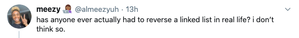 - They are biased towards recent CS graduates - This kind of question is going to mess up code school graduates mostly. Since code schools, oddly, emphasize practical real world skills.